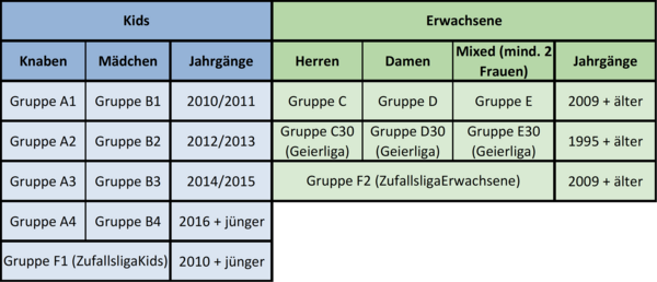 In allen Gruppen dürfen auch jüngere Spieler als der jeweils definierte Jahrgang mitspielen. Ausser in der Geierliga, dort MÜSSEN alle Spieler über 30 sein.
